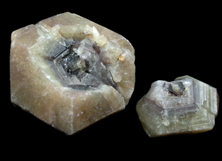 | Description: | Two crystals of greenish grossular(?) garnet with zoned coloration visible on the underside. The crystals were once attached, but split apart naturally. The largest crystal was restored from two pieces. Ex. A. Lincoln Sherk II, MD. (1896-1970) |