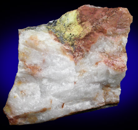 | Description: | Patches of yellow ferrimolybdite with metallic crystals of molybdenite frozen in milky quartz matrix. |