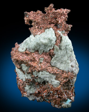 | Description: | Crudely crystallized native (naturally occurring) copper in greenish matrix. The copper is exposed on both front and rear. |