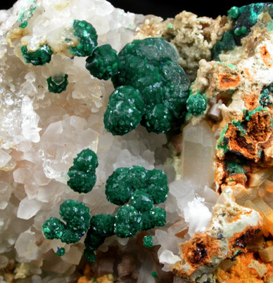 | Description: | Spherical crystal aggregates up to 2 mm diameter of dark green pseudomalachite on colorless quartz and pale green cuprous halloysite. Ex. John A. Rorer, Jr. collection #192; Ex. A. Kraatz Collection #5908 in Bonn, Germany |