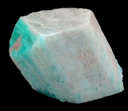 | Description: | Single crystal of microcline feldspar with faces showing blue-green color, variety amazonite. The blue-green color runs through the crystal, but several outer crystal faces are colorless - typical for amazonite. Ex. John A. Rorer, Jr. collection #305 |
