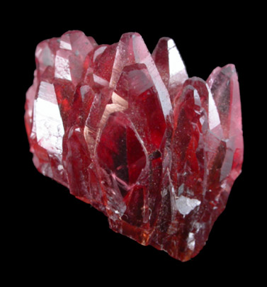 | Description: | Parallel cluster of transparent red rhodochrosite crystals with no matrix attached. This quality of rhodochrosite rarely is available today. Two crystals have cleaved tips visible under magnification. |