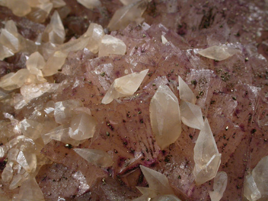 | Description: | Large plate of translucent fluorite crystals up to 20 mm with translucent yellow calcite crystals up to 10 mm and metallic pyrite crystals up to 1 mm. The fluorite is pink-gray with thin purple layer in some areas. A few calcite crystals are incomplete. |