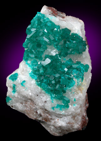 | Description: | Sparkling green dioptase crystals up to 4 mm on colorless calcite matrix. The calcite fluoresces orange under UV illumination. The dioptase crystals are transparent green with lustrous crystal surfaces. |