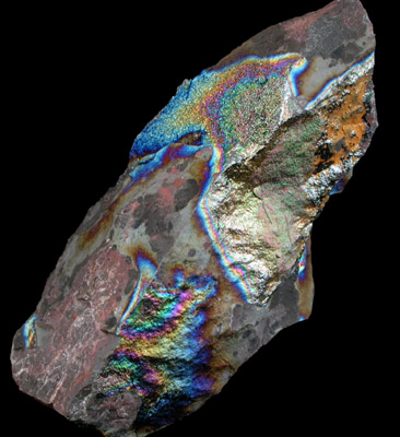 | Description: | Iridescent coating of hematite, variety turgite, on massive iron-rich matrix. The turgite has strong colors ranging from blue to purple. Under magnification the entire surface is seen to be covered with minute botryoidal crystals. |