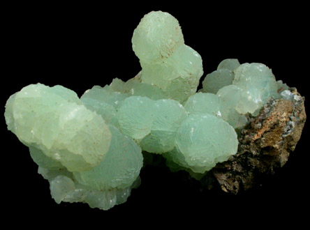 | Description: | Lustrous green prehnite crystals in spherical aggregates up to 16 mm diameter. The surfaces are all crystallized, with sharp faces visible throughout. Ex. John A. Manley (1861-1936) ca. 1890s |