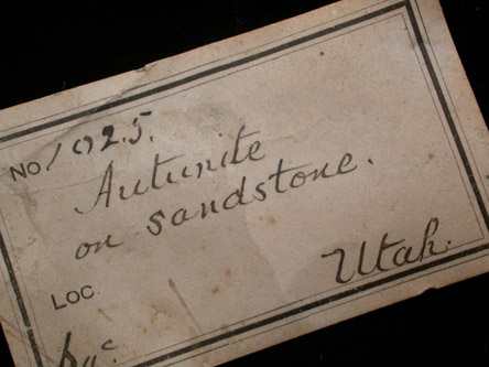 | Description: | Yellow-green autunite crystals scattered over several faces of brown sandstone matrix. Radioactive. Ex. John A. Manley (1861-1936) ca. 1890s |