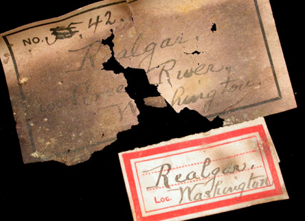 | Description: | Historic ore sample of granular red realgar with yellow pararealgar. Ex. John A. Manley (1861-1936) ca. 1890s |