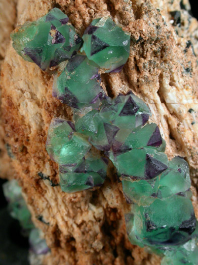 | Description: | Bright green translucent fluorite crystals up to 7 mm with small black schorl tourmaline crystals up to 5 mm covering several sides of a brown orthoclase crystal. The fluorite crystal are cubic crystal form, with some having purple corners. |