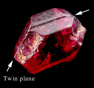 | Description: | Transparent red spinel crystal with glassy crystal faces. This specimen is twinned following the Spinel law (on the {111} plane) and the twin plane is visible around the perimeter. One edge is incomplete. Ex. Frank Jaeger collection |