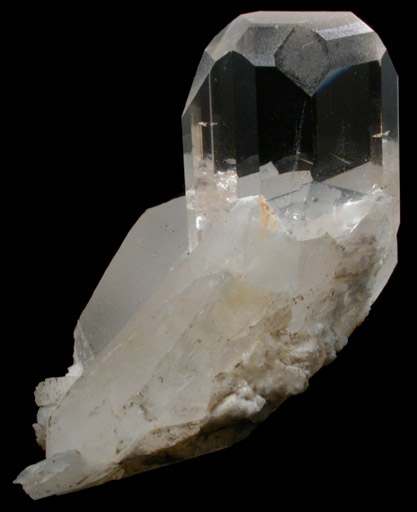 | Description: | Flawless crystal of colorless topaz perched on milky quartz matrix. The topaz crystal is prismatic form with complex termination faces. There is a small u-shaped hair-like inclusion near the base. A superb specimen - no damage. |