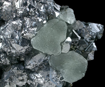 | Description: | Octahedral pale-green fluorite crystals up to 17 mm intergrown with bright metallic cubo-octahedral galena crystals up to 15 mm. The fluorite crystals are translucent and have an etched surface texture. |