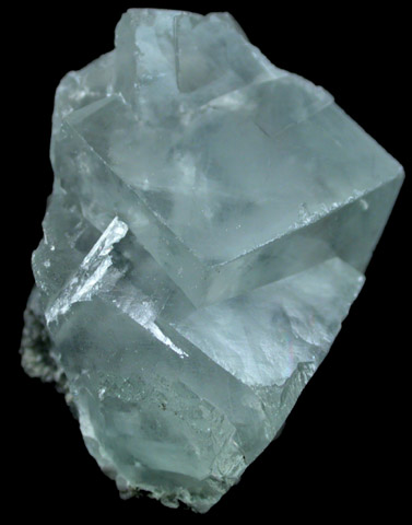 | Description: | Transparent green fluorite crystals with colorless calcite crystals on the rear faces. The fluorite crystals are cubic form with silky crystal faces. Scattered damage to the crystal edges. |