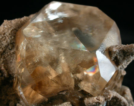 | Description: | Transparent golden calcite crystal nestled in fragments of limestone matrix. The calcite crystal has silky surface luster and excellent internal clarity. |