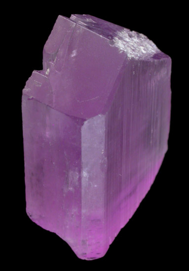 | Description: | Hot-pink transparent kunzite crystal (pink gem-grade spodumene) with steep termination on the top (+unusual intergrowth), and complex termination on the bottom. Excellent color, clarity and fluoresces under UV illumination. Weight: 35.5 grams |