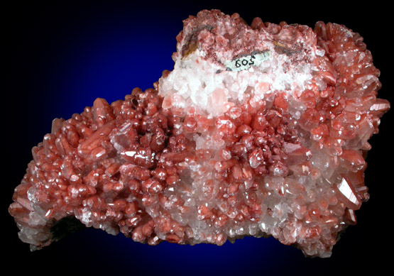 | Description: | Huge cluster of transparent colorless calcite crystals with bright red hematite inclusions. The calcite fluoresces and phosphoresces under UV illumination. The calcite crystal cover most of all sides of the specimen. A few crystals are missing. Ex. Woodhouse collection |