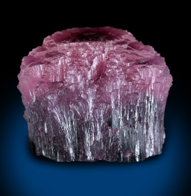 | Description: | Single crystal of elbaite tourmaline with black (schorl) core zone. The termination is transparent pink and has a flat basal pinacoid face surrounded by many parallel microfaces. If it grew further it would have formed a mushroom-shaped tourmaline. |