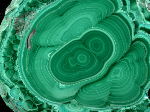 | Description: | Thin slab from a malachite stalactite polished on both sides to highlight the concentric growth layers. |