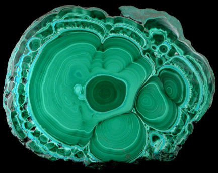 | Description: | Thin slab from a malachite stalactite polished on both sides to highlight the concentric growth layers of varying colors. Note this specimen has an outer layer of blue chrysocolla. The crystallization pattern is complex and different on opposite sides. |