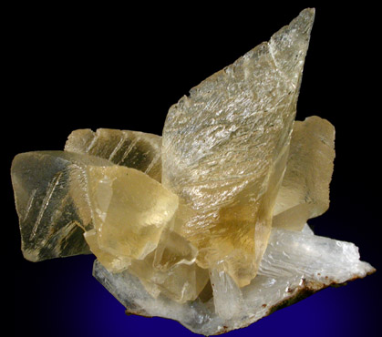 | Description: | Transparent yellow calcite crystals up to 30 mm long on colorless stilbite crystals up to 10 mm long. the calcite crystals have complex surface textures of smaller, parallel faces. |