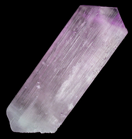 | Description: | Doubly-terminated single crystal of hot-pink kunzite, the pink gem variety of spodumene. The crystal has striated sides and chisel-shaped terminations. The pink color runs throughout, except one termination is greenish. |