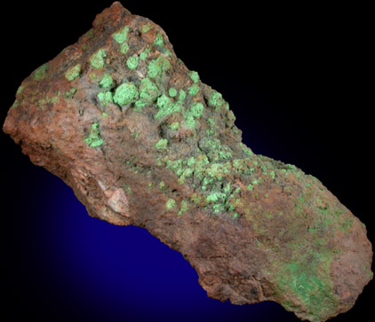 | Description: | Crude green chenevixite pseudomorphs after cuprite crystals up to 5 mm on brown matrix. |