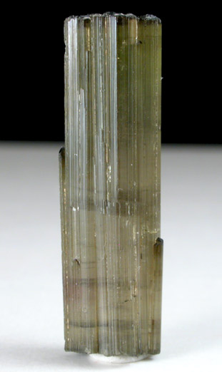 | Description: | Doubly-terminated transparent-to-translucent green elbaite tourmaline crystal with striated crystal faces. Both terminations are flat, with many smaller, parallel, shallow pyramidal crystal faces. Ex. John Albanese, Jr. |