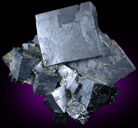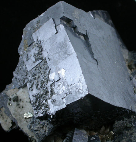 | Description: | Gray metallic galena crystals up to 45 mm with a few yellow metallic chalcopyrite crystals up to 3 mm. The galena crystals are cubic form with a few crystals showing octahedral growth hillocks. Ex. John Albanese (1898-1969), ex. John Albanese, Jr. |