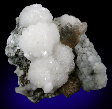 | Description: | White stilbite crystals in hemispherical aggregates up to 15 mm diameter with translucent brown heulandite crystals up to 7 mm. This is a very attractive miniature specimen. |