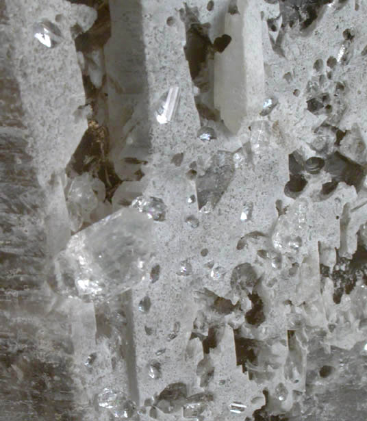 | Description: | Large milky quartz crystal 100 mm long with etched termination and pock-marked exterior surfaces on two sides. One side has many transparent colorless euclase crystals up to 5 mm scattered over the surface. |