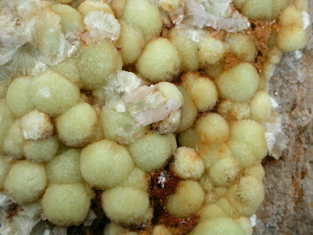 | Description: | New discovery of yellow-green wavellite crystals in hemispherical sprays up to 8 mm diameter (a few have popped off and exposed the radiating structure). The areas between the sprays have brownish limonite coatings. Collected in 2006 |
