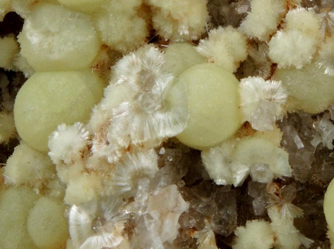 | Description: | Yellow-green wavellite crystals in hemispherical aggregates up to 7 mm diameter on gray limestone. The wavellite crystals show terminations when viewed under magnification and exhibit radiating internal structure where the centers are exposed. Collected in 2006 |