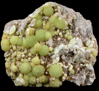 | Description: | New discovery of yellow-green wavellite crystals in hemispherical sprays up to 8 mm diameter (a few have popped off and exposed the radiating structure). This were professionally prepped to remove the limonite staining and shows very good color. Collected in 2006 |