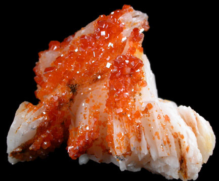 | Description: | Sparkling orange vanadinite crystals up to 1.5 mm scattered over bladed white barite crystals up to 16 mm. Though the vanadinite crystals are small, the contrast of the vanadinite against the barite is very attractive. |