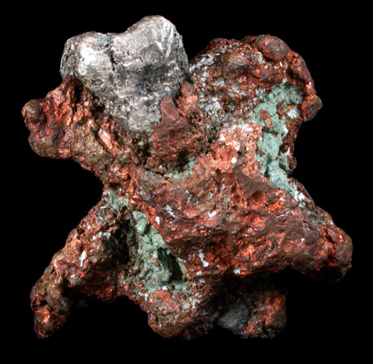 | Description: | Large mass of native silver on one edge of a native copper nugget. Local minerals refer to these as halfbreeds because both metals are present. |