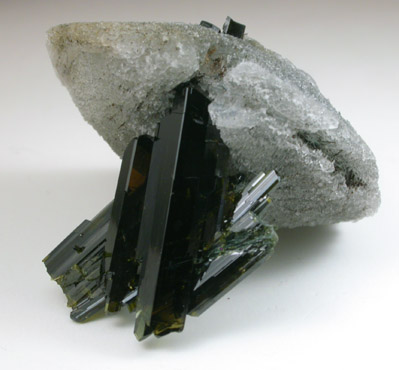 | Description: | Translucent gray discus-shaped calcite crystal 35 mm across with several translucent dark-green epidote crystals up to 25 mm growing through the calcite. The surface of the calcite is composed of many minute, parallel crystal faces. |