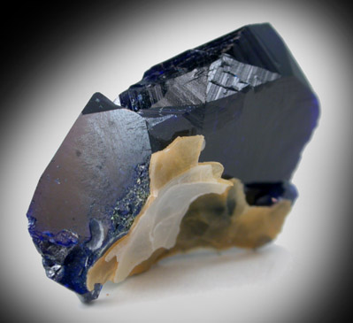 | Description: | Several dark blue azurite crystals with minor matrix attached. The azurite crystals are translucent in the tin areas and lustrous, except on the rear where the faces are slightly etched. |