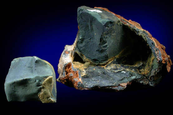 | Description: | Limonite concretion filled with earthy vivianite, a dense green mixture of vivianite and other minerals. The bottom of the concretion has lustrous black vivianite micro crystals. A second specimen, possibly from the same concretion has no limonite. Ex. Academy of Natural Sciences of Philadelphia collection #24198; ex. American Philosophical Society collection |