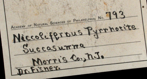| Description: | Dense mass of weathered brown pyrrhotite with greenish-brown apatite crystals included in the surface (similar mineralogy to the Phillips Mine across the Hudson River). Ex. Academy of Natural Sciences of Philadelphia collection #793, presented by Dr. Fisher |
