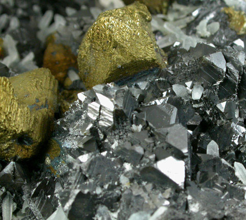 | Description: | Bright yellow-metallic complex chalcopyrite crystals to 10 mm on lustrous black tetrahedral sphalerite crystals to 15 mm with cubic gray-metallic galena crystals to 9 mm and translucent greenish quartz crystals to 6 mm. |