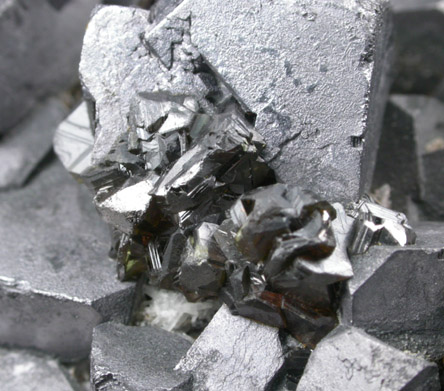 | Description: | Gray metallic cubo-octahedral galena crystals up to 12 mm across with translucent dark-yellow Spinel-law twinned sphalerite crystals up to 4 mm and colorless quartz crystals up to 2 mm on the rear. The largest galena crystals exhibit hoppered growth. |