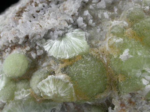 | Description: | Translucent yellow-green acicular wavellite crystals in spherical radial aggregates to 8 mm diameter on gray fine-grained limestone. The radial structure of the wavellite is visible where the aggregates have popped off. Collected in 2006 |