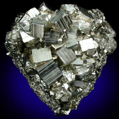 | Description: | Yellow metallic pyrite crystals with cubic form and striated crystal faces. |