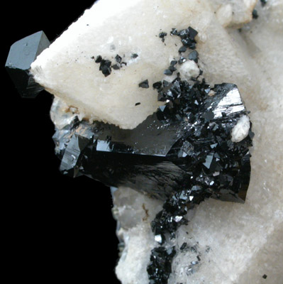 | Description: | Doubly-terminated scalenohedral calcite crystals up to 48 mm with lustrous black ilvaite crystals up to 17 mm scattered throughout. |