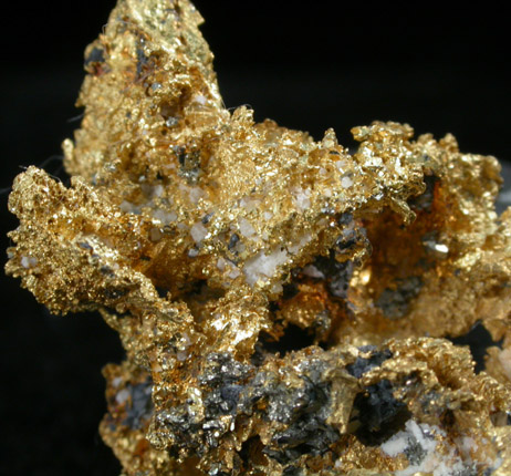 | Description: | Heavy mass of native gold crystals up to 1 mm across with dark metallic acanthite crystals up to 3 mm. Remnants of quartz matrix are in areas between the gold crystals. The association of acanthite (a silver mineral) with gold is uncommon. |