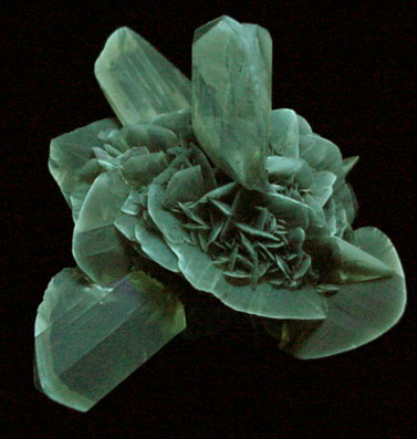 | Description: | Transparent yellow gypsum, variety selenite crystals showing fishtail twinning up to 28 mm protruding from a spherical cluster of smaller gypsum crystals. Fully crystallized all around with no point of attachment - a floater. Fluorescent under UV. |