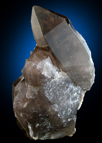 | Description: | Translucent smoky quartz crystal on smoky quartz matrix. The crystal has lustrous faces on the front, and etched faces on the back due to fluid flow through the pocket during formation. the rear is chipped, the front is undamaged. |