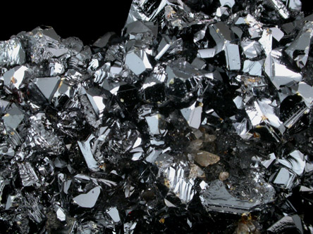 | Description: | Sparkling cluster of lustrous dark sphalerite crystals up to 7 mm with scattered golden calcite crystals up to 2 mm and transparent colorless quartz crystals up to 2 mm. The sphalerite shows translucency under strong illumination. |