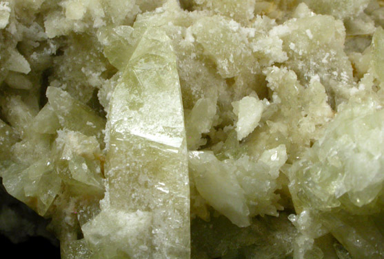 | Description: | Large crystal composed entirely of lustrous translucent yellow-green brazilianite crystals on all surfaces. The brazilianite crystals are asymmetric elongated points flattened on one side. The rear has grainy white albite partially coating crystal faces. |