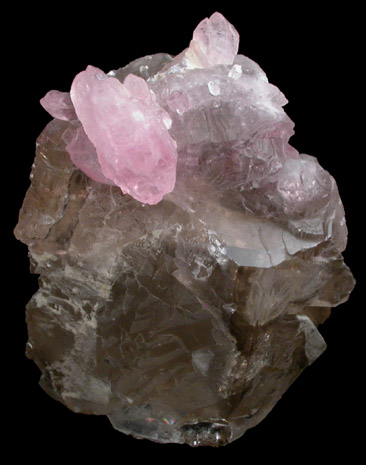 | Description: | Large, distinct rose quartz crystals up to 17 mm long on a heavily etched block of translucent smoky quartz showing complex crystal surfaces on all sides except the rear where it was attached to matrix. Rose quartz crystals are rare. |
